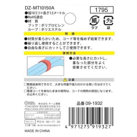オーム電機 マジックタイ 幅10mm 長さ1.5m DZ-MT10150A