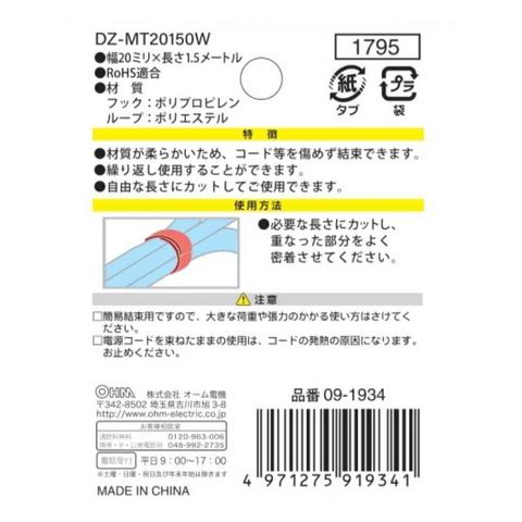 オーム電機 マジックタイ 幅20mm 長さ1.5m DZ-MT20150W