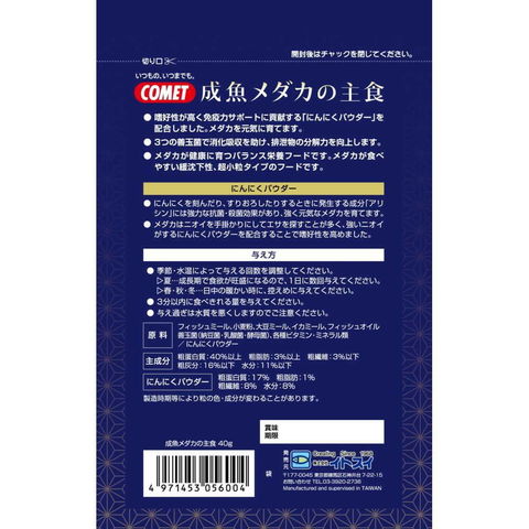 にんにくパウダー配合で嗜好性アップ、抗菌、殺菌効果により強く元気なメダカの育成し、3つの善玉菌で消化吸収を助け、排泄物の分解力を向上します。