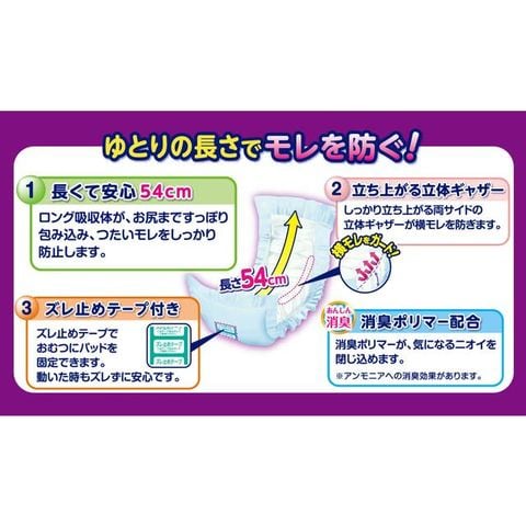 ●長さ54cm!ロング吸収体がお尻をすっぽり包み込み、つたいモレをしっかり防止!尿4回分をさらっと吸収。 ●しっかり立ち上がる立体ギャザーで横モレ防止! ●ズレ止めテープでおむつにパッドを固定し、動いた時もズレずに安心。 ●安心の消臭加工。 ●医療費控除対象品 エルモアいちばん いちばん 尿とりパッド 汎用パッド 長時間用 4回 立体ギャザー 日本製 国産