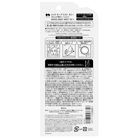 メイクの仕上げにひと吹き、化粧くずれを防ぐミストがパワーアップ! コーセーオリジナルの「スーパーメイクコート成分」を新配合。 表情の動きにもよれない優れた柔軟性をもつため、表情の変化によるメイクよれを防止。美しい仕上がりをキープします。 ● 高い皮脂プルーフ効果で、テカリ&毛穴落ち防止効果がパワーアップ! ● 高温多湿試験済み※ 蒸し暑い環境でもテカリやベタつきを防ぎ、美しい仕上がりをキープします。 ※化粧もちに関して(コーセー調べ。効果には個人差があります。) ● 新配合のシカ成分をはじめとする数種の保湿成分を贅沢に配合!肌にうるおいをあたえ、乾燥を防ぎます。 ● マスク着用によるメイクのよれや、マスクへのメイク移りを防ぎます。 ● 大気中の微粒子(ちり・ほこり・PM2.5など)からお肌をまもります。 ● アレルギーテスト済み ●ノンコメドジェニックテスト済み ※すべてのかたにアレルギーが起きない、コメド(ニキビのもと)ができないというわけではありません。 ● ジューシーフローラルの香り ● 無着色