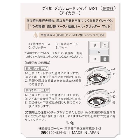 効果的なご使用法 (抜け感ツヤ仕上げ) : A 上まぶた・下まぶた全体にのばします。B アイホールから下まぶたまでぼかします。C 目頭や涙袋など輝きをあたえたい部分にのせます。 (奥行きマット仕上げ) A 上まぶた・下まぶた全体にのばします。D アイホールから下まぶたまでぼかします。E 目のきわ・下まぶたの目じり側にライン状にぼかします。