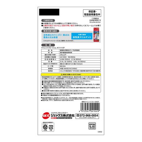 本製品は屋内観賞魚飼育専用です。他の目的、屋外では使用しないでください。子供に操作・セットさせる場合は、大人の監視のもとで行ってください。セット時、魚の出し入れ、点検、掃除など水中に手を入れる時は、必ず水槽で使用している電気製品全ての差し込みプラグを抜いてください。本製品は、直射日光のあたる所や湿気・ほこりの多い所、油煙や湯気のあたる所では使用しないでください。海水水槽で使用する場合は、塩分や汚れをこまめに拭き取ってください。
