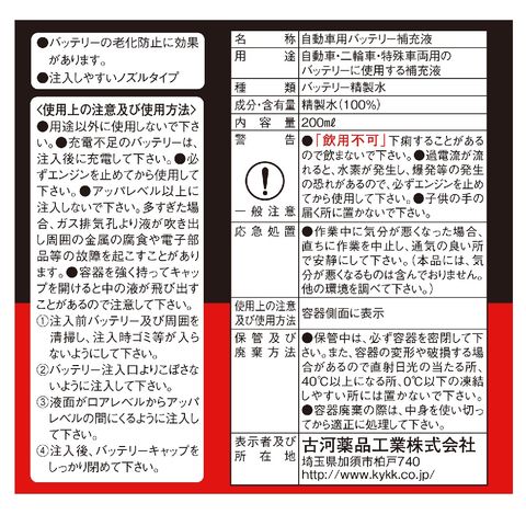 鉛バッテリー以外には使用しないで下さい。注入時は電解液(希硫酸)の液跳ねに注意して下さい。充電不足のバッテリーは、本液注入後に充電して下さい。最高液面(アッパーレベル)以上に液を入れすぎますと、走行中に液が噴き出ることがありますので注意して下さい。