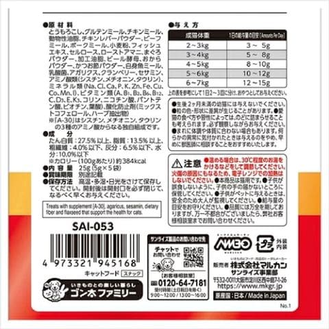 給与量の目安を参考にして、1日2‐3回に分け、おやつとして与えてください。●生後2ヶ月未満の幼猫には与えないでください。