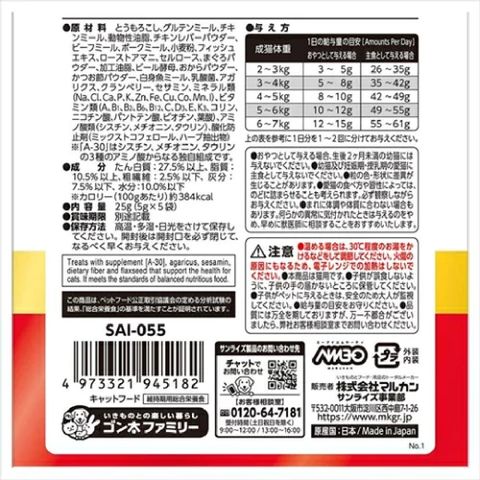 とうもろこし、グルテンミール、チキンミール、動物性油脂、チキンレバーパウダー、ビーフミール、ポークミール、小麦粉、フィッシュエキス、ローストアマニ、セルロース、まぐろパウダー、加工油脂、ビール酵母、おからパウダー、かつお節パウダー、白身魚ミール、乳酸菌、アガリクス、クランベリー、セサミン、ミネラル類(Na、Cl、Ca、P、K、Zn、Fe、Cu、Co、Mn、I)、ビタミン類(A、B1、B2、B6、B12、C、D3、E、K3、コリン、ニコチン酸、パントテン酸、ビオチン、葉酸)、アミノ酸類(シスチン、メチオニン、タウリン)、酸化防止剤(ミックストコフェロール、ハーブ抽出物)