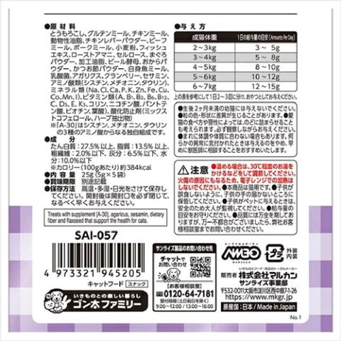 給与量の目安を参考にして、1日2‐3回に分け、おやつとして与えてください。●生後2ヶ月未満の幼猫には与えないでください。