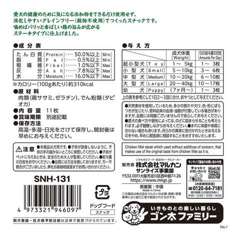 【原材料】肉類(鶏ササミ、ゼラチン)、でん粉類(タピオカ)【成分】たん白質50.0%以上、脂質0.5%以上、繊維質1.0%以下、灰分7.8%以下、水分16.0%以下