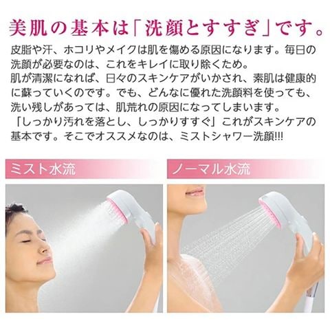 商品説明●2つの水流に切替えができる、洗顔にぴったりなシャワーヘッドです。 ●「ミスト水流」は洗顔に適した直径約1mm×24穴のスクリュー構造で起きるミスト水流の微粒子が、汚れをしっかり洗い流します。 ●「ミスト水流」は手洗いの約半分の水圧(※1)が肌への刺激を抑え、通常のシャワーより水温(※2)が3度下がり、洗顔に適した人肌温度で乾燥を防ぎます。 ●「ノーマル水流」は洗髪やボディ洗いに適した直径約0.5mm107穴の水流が、なめらかな肌あたりです。 ●流しっぱなしを防ぐストップボタン付きで、ノーマル水流では約45%、ミスト水流では約70%の節水効果が得られます。 ●取り付けは手でくるっと回すだけ、付属アダプター入りで、ほとんどのメーカーのホースに対応します。 ●手元ストップ機能が付いているので、ちょっと止めたい、節水したい時に便利です。