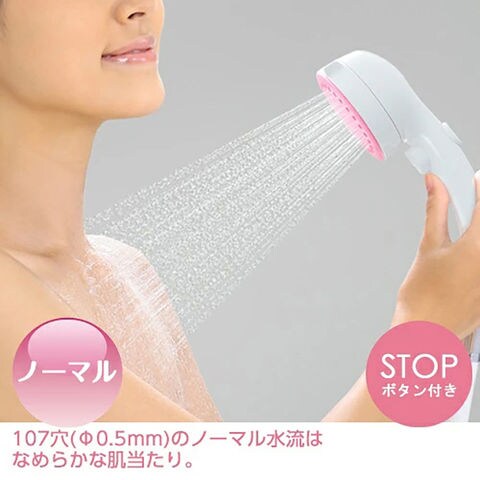 商品説明●2つの水流に切替えができる、洗顔にぴったりなシャワーヘッドです。 ●「ミスト水流」は洗顔に適した直径約1mm×24穴のスクリュー構造で起きるミスト水流の微粒子が、汚れをしっかり洗い流します。 ●「ミスト水流」は手洗いの約半分の水圧(※1)が肌への刺激を抑え、通常のシャワーより水温(※2)が3度下がり、洗顔に適した人肌温度で乾燥を防ぎます。 ●「ノーマル水流」は洗髪やボディ洗いに適した直径約0.5mm107穴の水流が、なめらかな肌あたりです。 ●流しっぱなしを防ぐストップボタン付きで、ノーマル水流では約45%、ミスト水流では約70%の節水効果が得られます。 ●取り付けは手でくるっと回すだけ、付属アダプター入りで、ほとんどのメーカーのホースに対応します。 ●手元ストップ機能が付いているので、ちょっと止めたい、節水したい時に便利です。