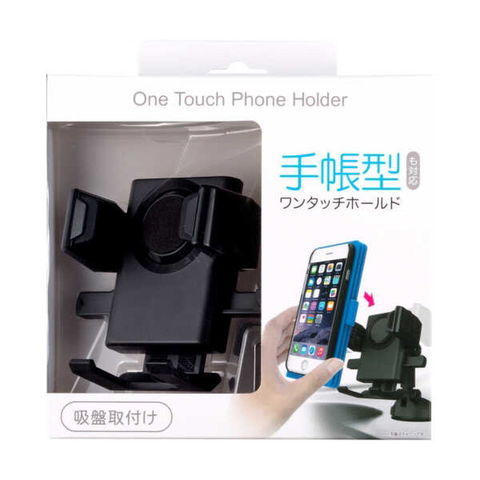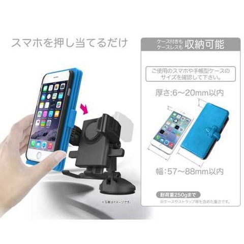 大きな手帳型ケースからスリムケース、ケースレスまで収納できるホルダー・スマホを押すだけのワンタッチホールド機構・取付け自在なゲル付き吸盤を採用(補助板が付属)