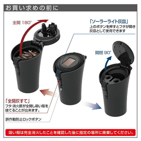 ●「全開灰すて」機能でフタが90度、消火部が180度に開く灰皿です。