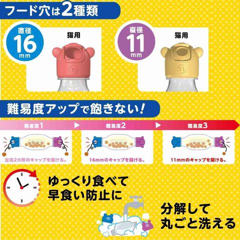 転がすとボトルの両サイドからおやつが出てくる知育玩具とフードのセット。