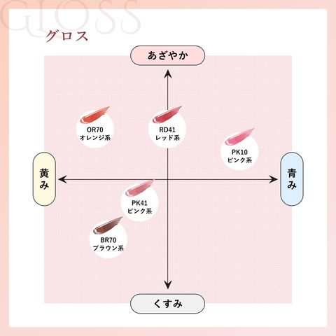 ●【ぷるつや質感のグロスタイプ】華やかな印象や明るい印象を与えたいときにおすすめの「グロス」。みずみずしいつやと高発色で、洗練されつつ華やかな仕上がりです。
