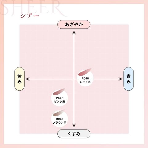 ●【透けつや質感のシアータイプ】ナチュラルで親しみやすい印象を与えたいときにおすすめの「シアー」。自然で肌になじみ、バランスの取れた仕上がりです。