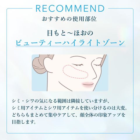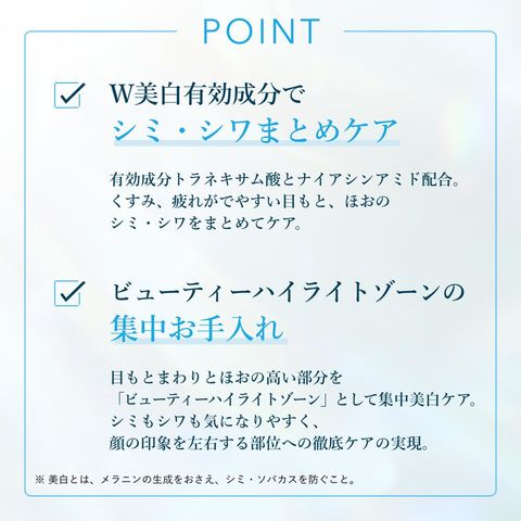 ●【目もと・ほお用】顔の印象を左右するビューティーハイライトゾーン※1を集中ケアすることで、明るい印象へ導くプラスワンアイテムです。(※1 目もとまわりとほおの高い部分を指す、顔の印象を左右する部位の総称)
