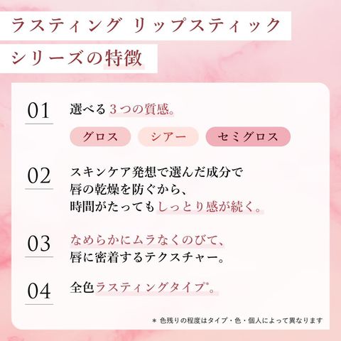 ●【選べる3つの質感があるラスティングリップスティック】グロス・シアー・セミグロスの3タイプ展開。なりたいイメージや使用シーンに合わせお選びいただけます。