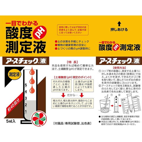 酸度(pH)測定液、簡単、手軽、アースチェック、土、土壌、植物、栽培、植え付け、植え替え、園芸、菜園、栽培、農園、田畑、ガーデニング、花、野菜、果樹、庭木
