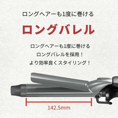 ロングヘアーも一度で巻ける、約142mmのロングバレルを採用。サロンワークの効率化を図ります。