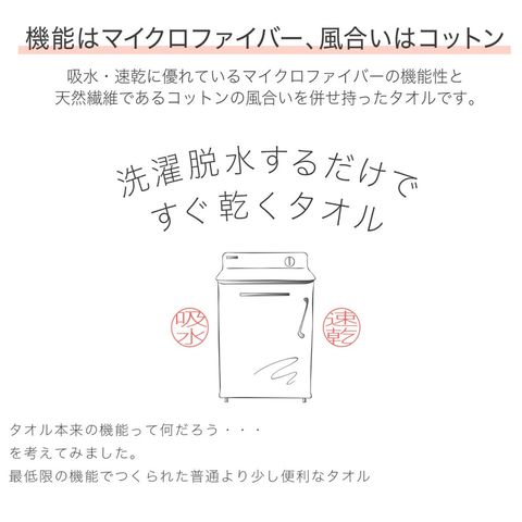 機能はマイクロファイバー、風合いはコットン。吸水・速乾に優れているマイクロファイバーの機能性と天然繊維であるコットンの風合いを併せ持ったタオルです。