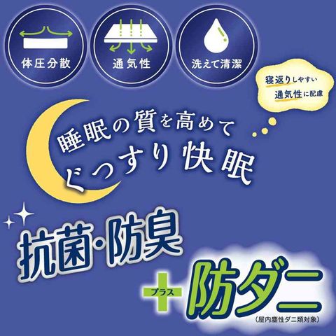 ・6つの快適機能(体圧分散、通気性、丸洗いOK、防ダニ加工、抗菌・防臭加工、滑り止め付き)で質の良い睡眠をサポート。
