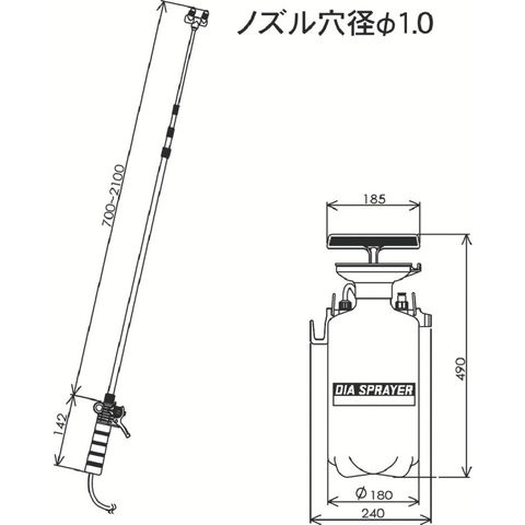 商品説明●使いやすさと耐久性に優れます。●伸縮式ノズル(ステンレス)で高所・遠所の散布が楽です。●二頭式噴口で作業が早くできます。●容量(L):5●ノズル:二頭口●ノズル長(mm):700~2100●ホース長さ(m):5●幅(mm):240●奥行(mm):180●高さ(mm):490●噴射能力(cc/分):(参考値)霧:400/直射:700 質量2.75kg