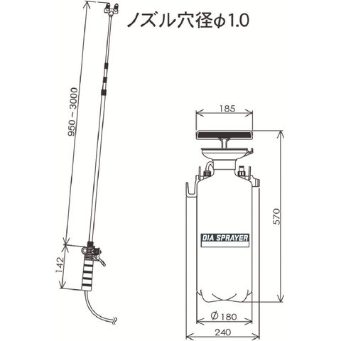 商品説明●使いやすさと耐久性に優れます。●伸縮式ノズル(ステンレス)で高所・遠所の散布が楽です。●二頭式噴口で作業が早くできます。●容量(L):7●ノズル:二頭口●ノズル長(mm):950~3000●ホース長さ(m):5●幅(mm):240●奥行(mm):180●高さ(mm):570●噴射能力(cc/分):(参考値)霧:400/直射:700 質量3.2kg