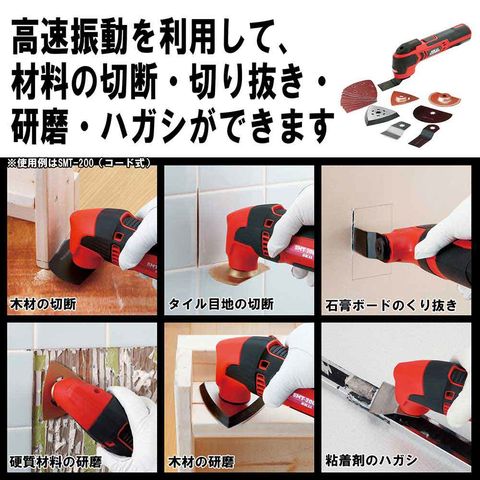 商品説明高速振り子運動、先端工具で切断・研磨・はがしなどいろんな作業ができるマルチツールで、充電式なので電源から離れた場所での作業もできます。