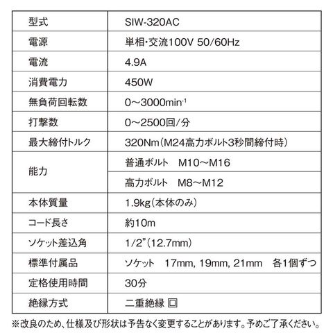 ●最大締付トルク:320Nm(M24高力ボルト3秒間締付時)。