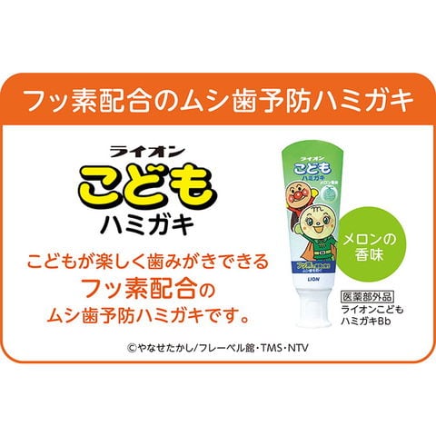 子どもが楽しく歯みがきできるムシ歯予防ハミガキ。・フッ素が酸に負けない強い歯をつくり、ムシ歯を予防します。・乳幼児に人気の高い「アンパンマン」をパッケージに採用。・子どもに人気の「メロン」の香味です。
