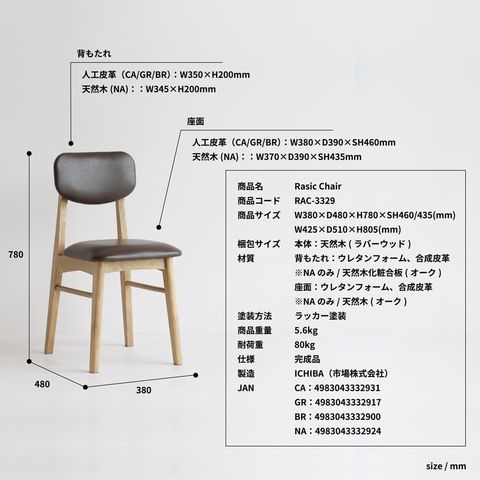幅380×奥行480×高さ780×座面高460mm