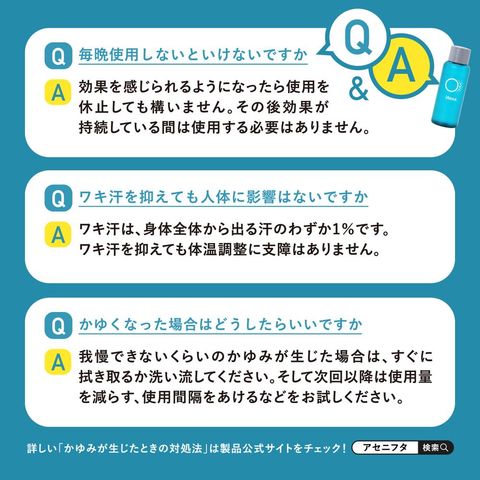 はじめての方は少量からご使用ください。かゆみが生じた場合はすぐに拭き取るか、洗い流してください。