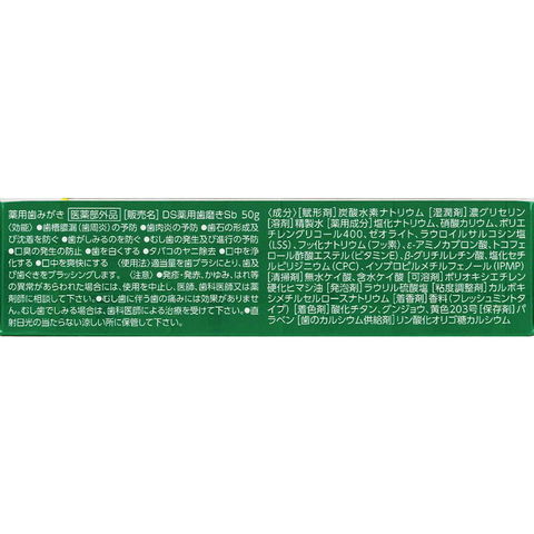 【薬用成分】 塩化ナトリウム、硝酸カリウム、ポリエチレングリコール400、ゼオライト、 ラウロイルサルコシン塩(LSS)、フッ化ナトリウム(フッ素)、 ε-アミノカプロン酸、トコフェロール酢酸エステル(ビタミンE)、 β-グリチルレチン酸、塩化セチルピリジニウム(CPC)、 イソプロピルメチルフェノール(IPMP)