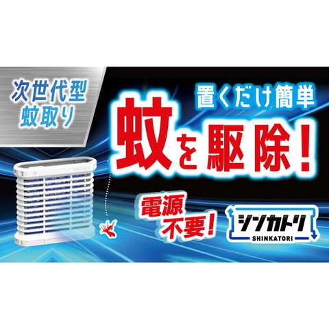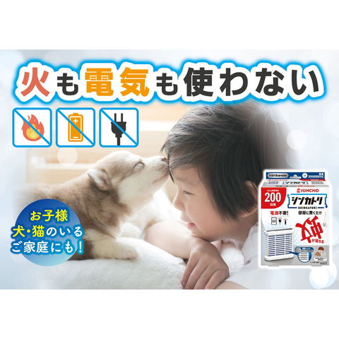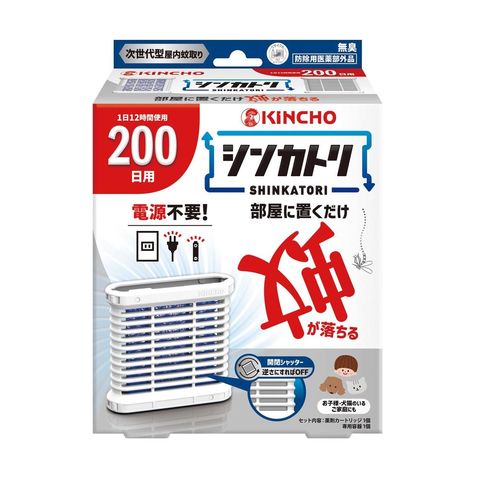 部屋に置くだけ蚊が落ちる。 次世代型屋内蚊とり「シンカトリ SHINKATORI」。 無臭。 1日12時間使用200日用。 電源も電池も不要。 灯油不使用。 オン・オフは片手で容器を上下逆さまにするだけの簡単操作。 リサイクル(PET→カートリッジ)。 電源不要でどこにでも置ける ●火気に対する心配がなく、置いたままでも安心。 ●お子様、犬、猫のいるご家庭でも使えます。玄関、寝室、子供部屋。 KINCHO独自の非加熱式薬剤拡散システムエアフローリリース技術 屋内の空気の流れを利用、お部屋に薬剤が拡散。 置くだけで約200日間、蚊のいない屋内空間をつくります。 使用環境により効果は異なります。