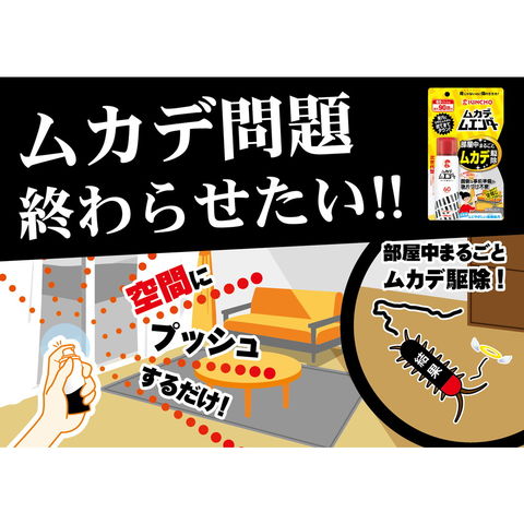 ●次世代型ムカデ駆除剤!※空間プッシュ式。準備・片付け・手間いらず!家中まるごとムカデ駆除! ●広さに合わせた回数を空間にプッシュするだけ! ●薬剤がスミズミまでいきわたり、隠れたムカデも追い出し、退治! ●アリ、クモなども簡単・手軽にまとめて駆除。 ●60プッシュ。最大90畳分。 ●無臭性。 ●煙じゃないのに煙のききめ! ●低刺激。人にやさしい無煙(ムエン)処方。 ●屋内にひそむムカデも出てきてダウン!空間定量噴射式殺虫剤。 ●生活害虫防除剤協議会登録。 【適用害虫】 ムカデ(トビズムカデ、アオズムカデ、セスジアカムカデ、ノコバゼムカデ、イッスンムカデ)、ゲジゲジ、ヤスデ、アリ、クモ、セアカゴケグモ、カメムシ、チャタテムシ、シバンムシ、カツオブシムシ、ユスリカ、ダンゴムシ、ワラジムシ、ガ、コバエ(ショウジョウバエ)、チョウバエ、コクゾウムシ、ハサミムシ、タカラダニ