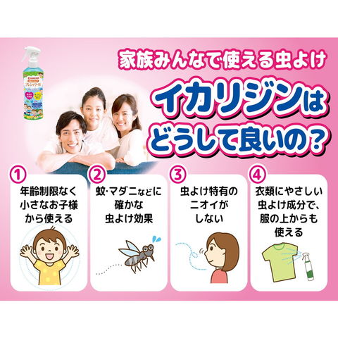 有効成分「イカリジン」配合。 小さなお子様から使えるミストタイプのお肌にやさしい虫よけスプレー。 ヒアルロン酸Na配合、保存料無添加の低刺激処方。 無香料。 ミネラル成分豊富な海洋深層水使用。 皮ふアレルギーテスト済み(すべての方にアレルギーが起きないというわけではありません)