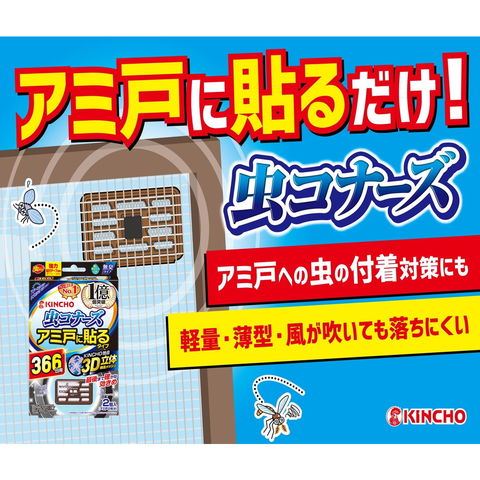 ●アミ戸への虫の付着や小さな虫の侵入を防ぐために! ●無臭タイプ。 ●雨にぬれてもOK。 ●強力貼り付けテープ採用(面ファスナー・当社比)。 <最後まで確かな効きめKINCHO独自の3D立体構造メッシュ> (1)立体構造で表面積を拡大!ワイドに薬剤が広がる(当社比) (2)メッシュの中に薬剤が練り込み。薬剤が徐々に拡散し、最後までしっかり広がる。 (3)雨でも流れ落ちにくい!軽量設計で、薄型タイプ、貼付テープ(面ファスナー)で簡単取り付け。 【特長】 ●メッシュの中に薬剤が練りこんであり、約366日間効果を発揮。アミ戸への虫の付着やアミ戸の目を通過しようとする小さな虫の侵入を防ぐためにご使用ください。 ●アミ戸に貼るだけの簡単虫よけ。目立ちません。 ●面ファスナーでアミ戸に簡単にしっかり貼ることができます。風が吹いても落ちにくい形状です。 ●生活害虫防除剤協議会登録。 【適用害虫】 ユスリカ・チョウバエ