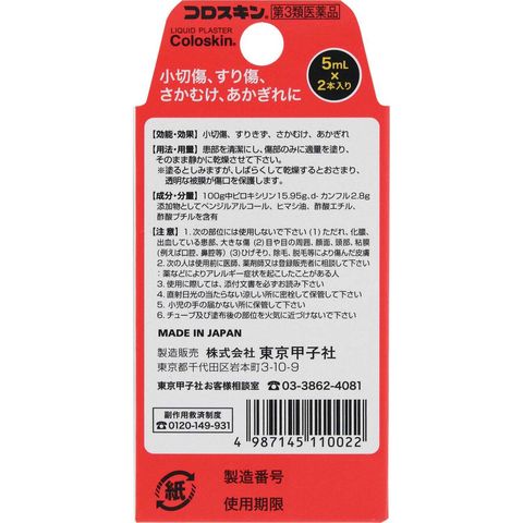 商品説明コロスキンは、さかむけやあかぎれ、小さな切り傷、すり傷をバイ菌から守る液状の絆創膏です。