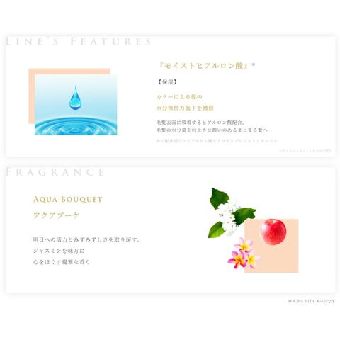 【美しいカラーヘアを叶える4つのラインナップ】 リッチは、髪のパサつきをケア。 カラーによる髪の水分保持力低下を補修。 毛髪表面に吸着するヒアルロン酸配合。 毛髪の水分量を向上させ、潤いのあるまとまる髪へ。 ジャスミンがベースの、透明感のあるやさしい香り。