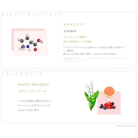 【美しいカラーヘアを叶える4つのラインナップ】 スウィーティアは、髪の熱ダメージをケア。 カラーによって耐性が低下する熱ダメージを補修。 ドライヤーやアイロンによる熱ダメージを受けた毛髪に作用する複合アミノ酸配合。 硬くなった毛髪に浸透・補修しなめらかで柔らかな髪へ。 ベリーとミュゲをブレンド。みずみずしく、ふんわり甘い香り。