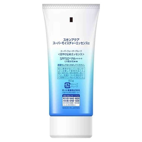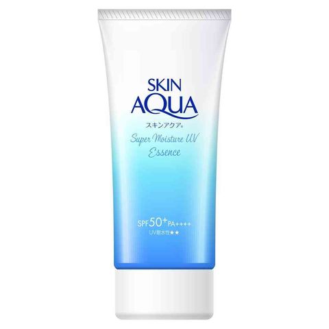 「スキンアクア スーパーモイスチャーエッセンス」 リッチなうるおいの使用感続くエッセンスタイプの日やけ止め。 ヒアルロン酸Naと超低分子ヒアルロン酸が肌表面と角層深くで保水し、肌吸着型ヒアルロン酸が肌表面にうるおいを留めます。 無香料、無着色、鉱物油フリー、パラベンフリー。 水に強いスーパーウォータープルーフ。 石けんで落とせます。 顔・からだ用で、化粧下地にもオススメです。 たっぷり使える80g。 SPF50+/PA++++/ UV耐水性★★。 スキンアクア・スーパーモイスチャーエッセンス