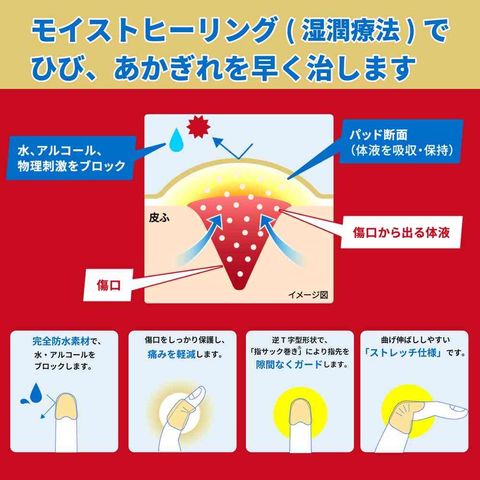 ひび、あかぎれ、軽度のきり傷、すり傷、さし傷、かき傷、さかむけ、靴ずれ等の創傷及び軽度のやけどの「保護」、「湿潤環境の維持」、「治癒の促進」、「痛みの軽減」