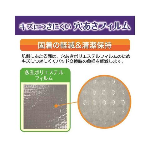 ●創傷側(肌側)は穴あきポリエステルフィルムのため、創に固着しにくく、パッド交換時の使用者の負担を低減します。
