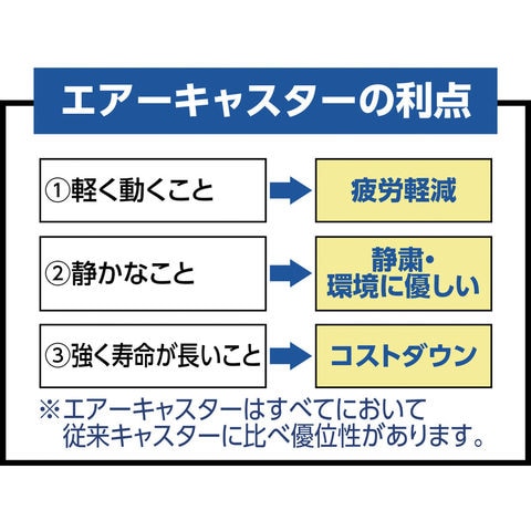 商品説明●エアーキャスターの採用により、軽量で静かです。●EVA樹脂バンパーを全周に施し、ササクレやバリを抑えます。●バンパーにより衝突時の衝撃を緩和します。●均等荷重(kg):200●長さ(mm):800●幅(mm):550●高さ(mm):111●板厚(mm):18●キャスター径(mm):75●取替キャスター(自在):ALG-75NRB/E●完成品 質量7kg