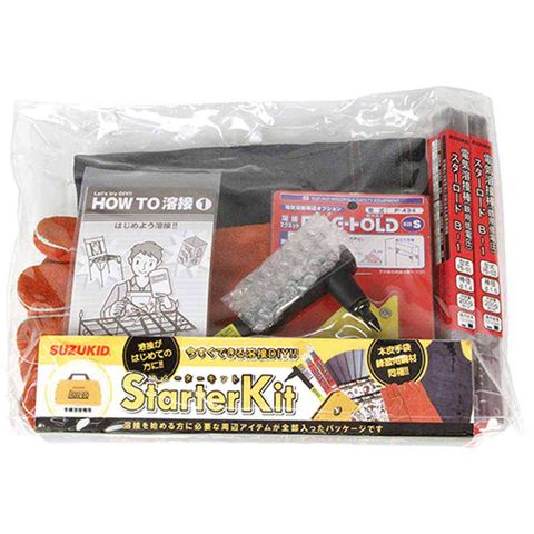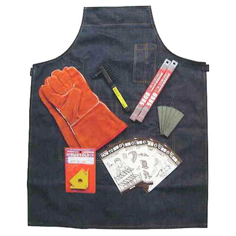 溶接作業を行う上で必要な溶接捧(2種類)、体を保護する手袋とエプロン、溶接母材を固定するマグネット、その他練習用鋼材、HOWTO冊子がセットされています。
