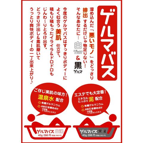 湯上りぽっかぽか、肌すべすべ。 投入してビックリ、黒ゲルマ風呂。 有機ゲルマニウム(※1)にミネラルを含んだ死海の泥(※2)を配合。 さらに天然塩とトウガラシエキス(保湿成分)もプラス。 真っ黒のお湯に体を浸してじんわり汗出し&素肌磨いて、うっとり爽快ボディの出来上がり! ※1レパゲルマニウム(保湿成分) ※2海シルト(保湿成分)