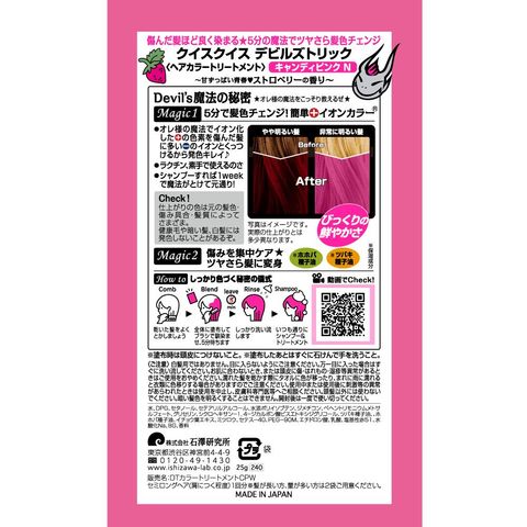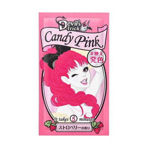 傷んだ髪ほどよく染まるヘアカラートリートメントで、“常色”はずれの映え発色! 素手で簡単、たった5分おいて流すだけ。 約1週間でもとの髪色に戻るから気軽に髪色チェンジ! 甘ずっぱい青春、キャンディピンク。ストロベリーの香り。