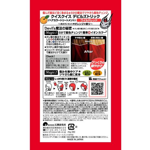 傷んだ髪ほどよく染まるヘアカラートリートメントで、“常色”はずれの映え発色! 素手で簡単、たった5分おいて流すだけ。 約1週間でもとの髪色に戻るから気軽に髪色チェンジ! 炎のサンセット、ワイルドレッド。オレンジの香り。