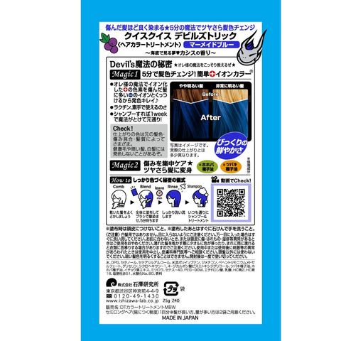 傷んだ髪ほどよく染まるヘアカラートリートメントで、“常色”はずれの映え発色! 素手で簡単、たった5分おいて流すだけ。 約1週間でもとの髪色に戻るから気軽に髪色チェンジ! 海底で見る夢、マーメイドブルー。カシスの香り。