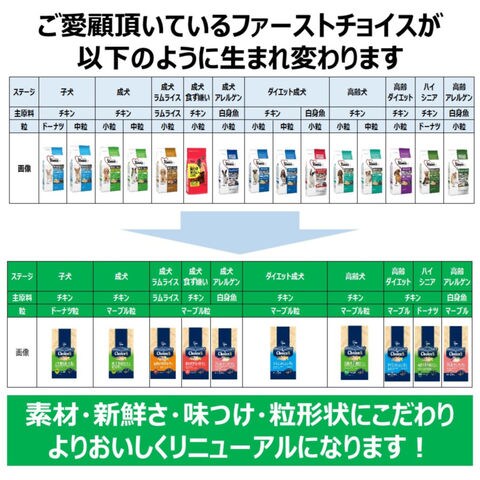 ●愛犬の体重に合った適切な量を1日2~3回に分けて与えてください。食事の量は環境や運動量によって異なります。愛犬の体調に応じてフードの量を調整してください。新鮮な水をいつも飲めるようにしておいてください。他のフードからファーストチョイスに切り替えるとき、これまでのフードに少しずつ混ぜ、ファーストチョイスの比率を徐々に増やしながら、1週間程度かけて完全に切り替えてください。